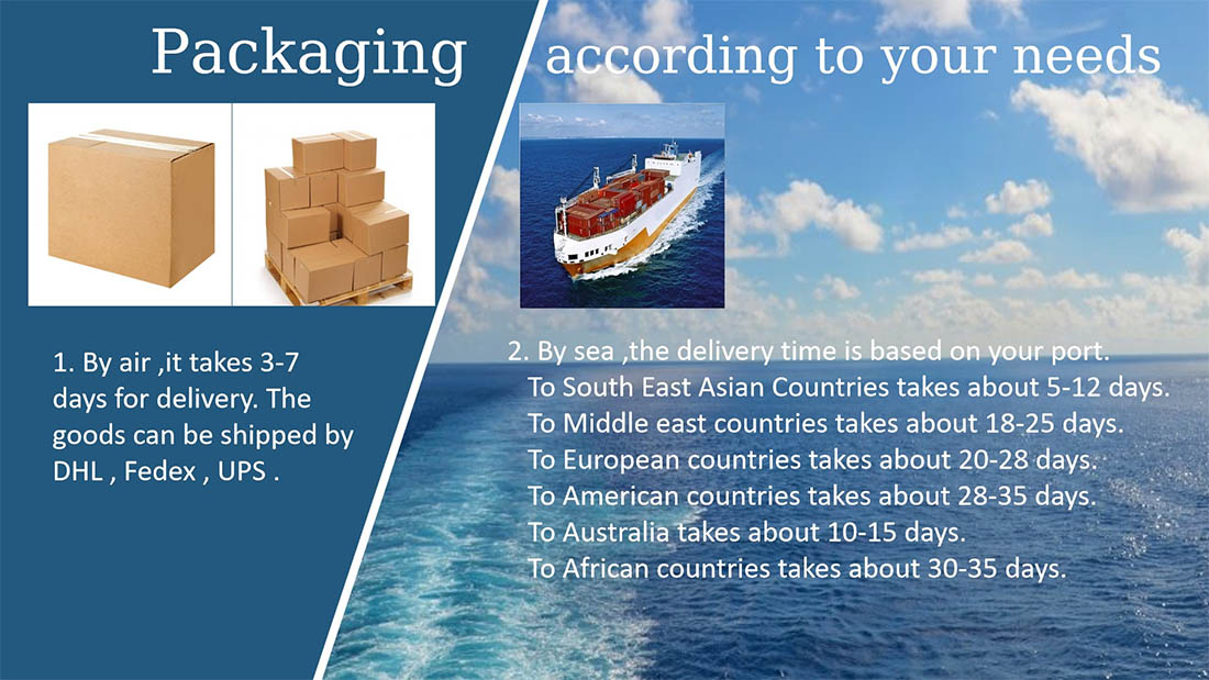 1. door lucht, het duurt 3-7 dagen voor levering. De goederen kunnen worden verzonden door DHL, FedEx, UPS.